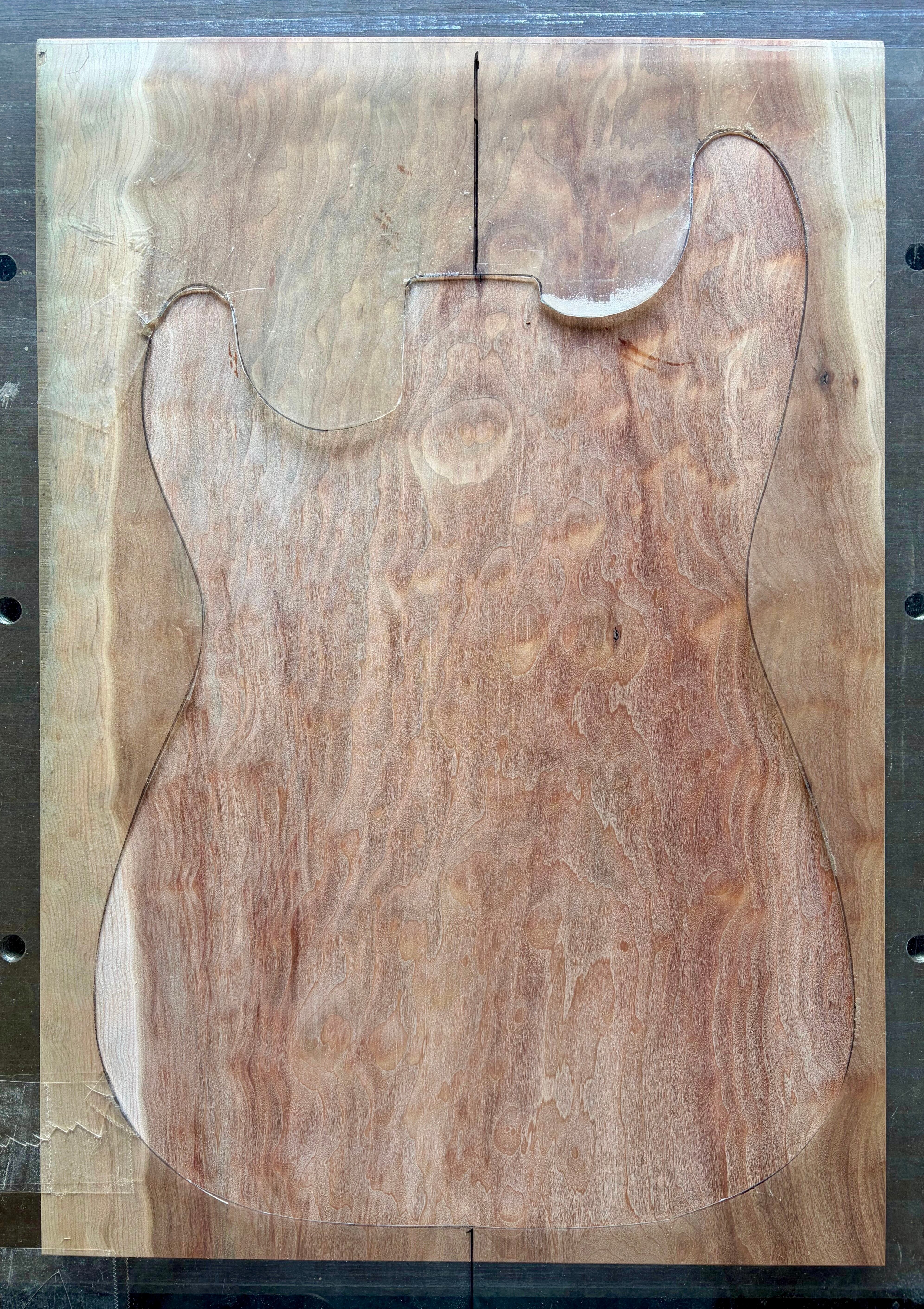 緋桂はエレキギター用材としては珍しいと思います。若干アルダーよりも柔らかい傾向でとても加工しやすい材です。ソリッドは勿論、ホローボディやシンライン系のボディトップ材として使用するのも面白いかもしれません。