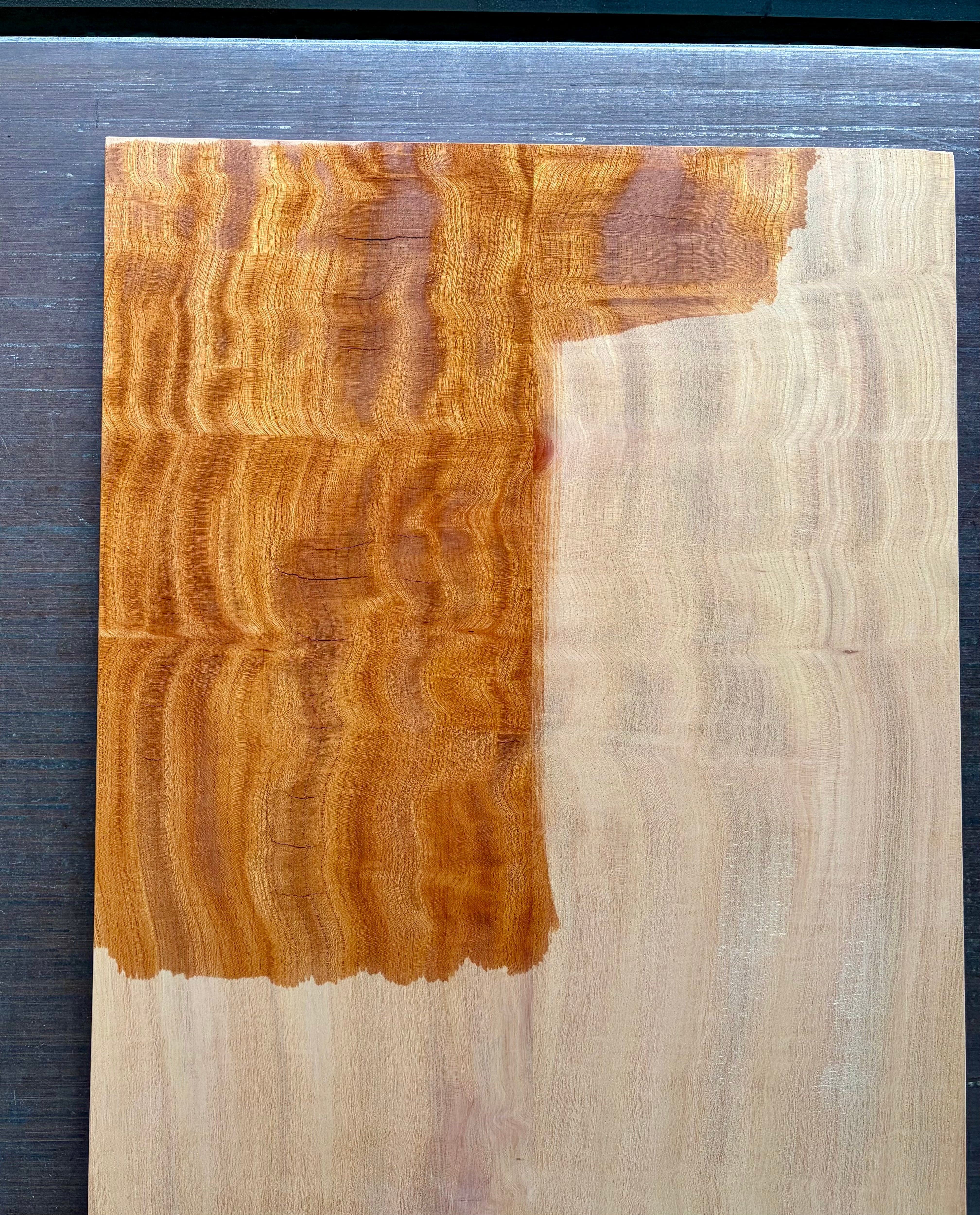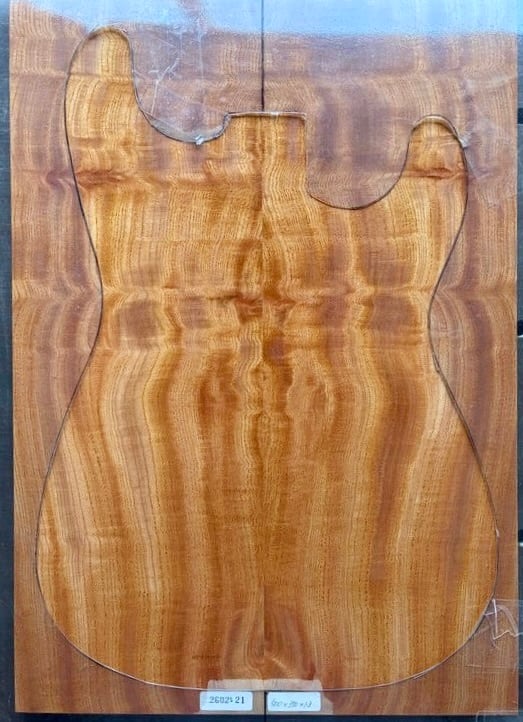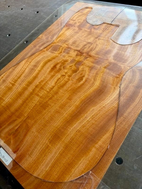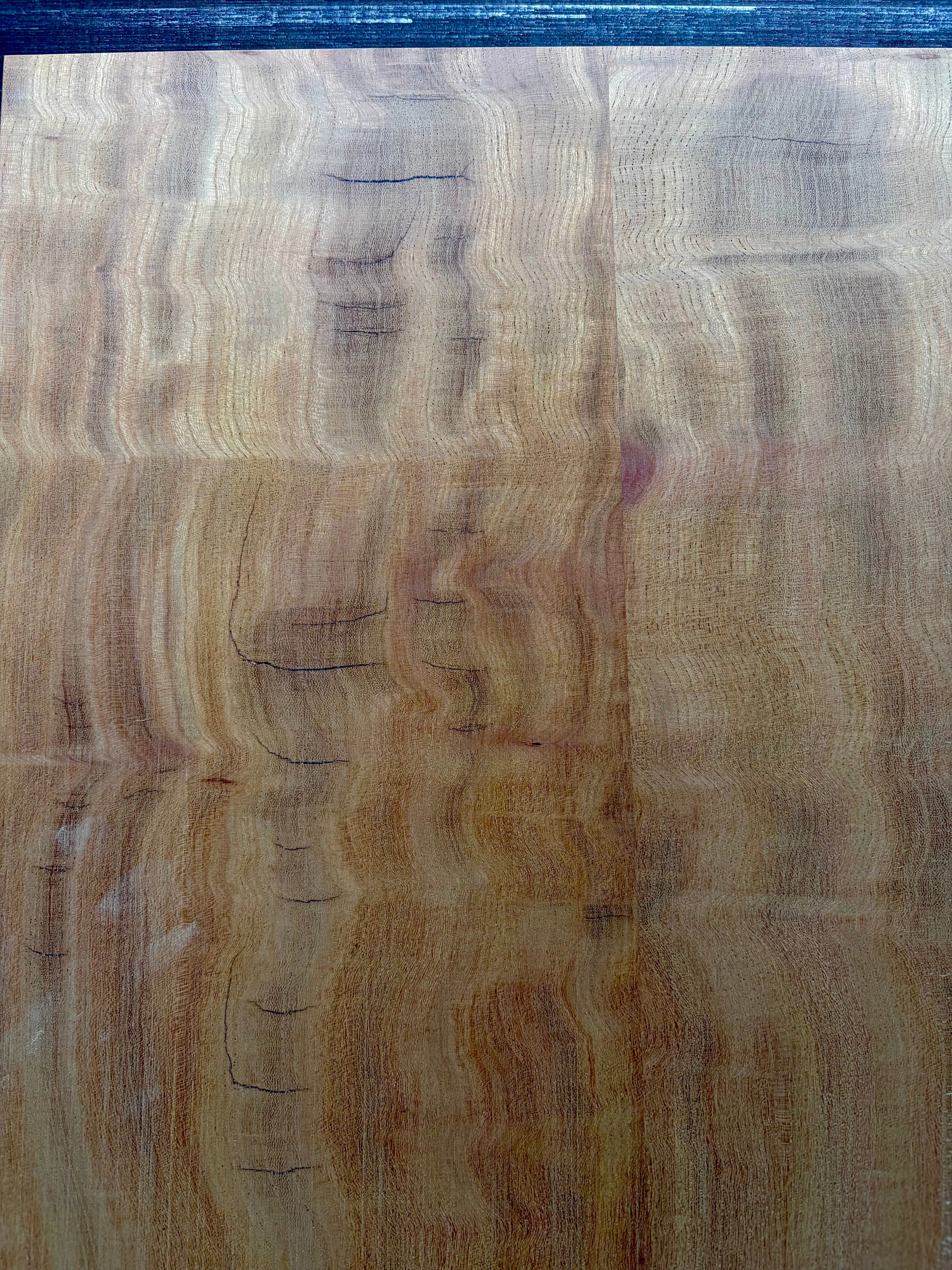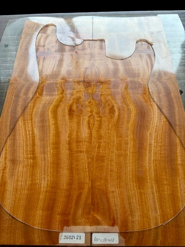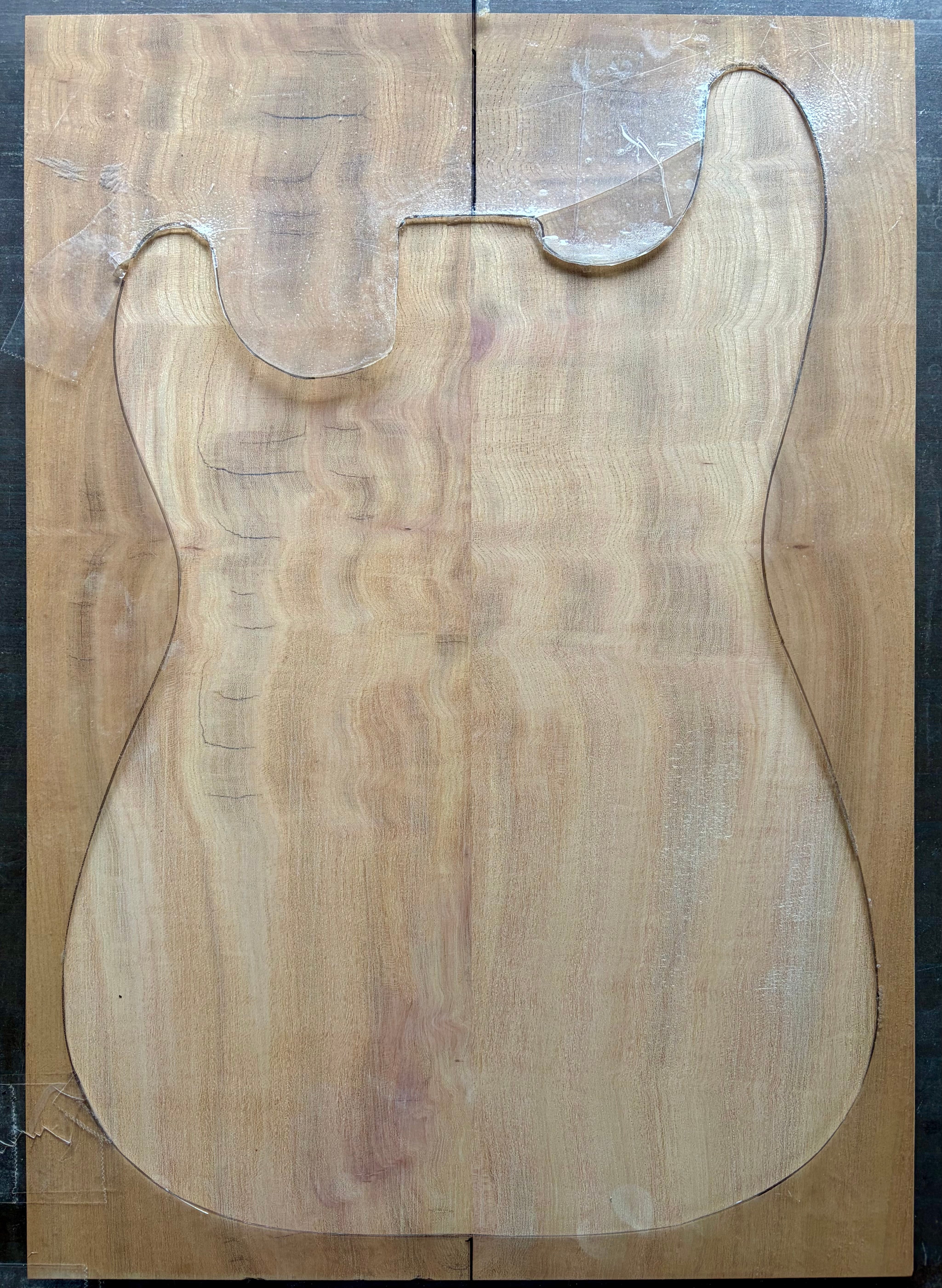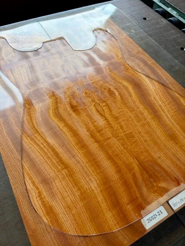 フィギュアード欅のセンターブックマッチ ボディTOP用材です。とても綺麗な杢が出ていますが、ところどころ割れが見られます(特に裏面)。割れている部分には瞬間接着剤を充填して割れが進行しない為の処置をしております。加工の際には接着剤と削り粉を混ぜて充填することをお勧めします。上記の通り訳アリ品となっておりますので、ご購入前には必ず写真をご確認下さいませ。